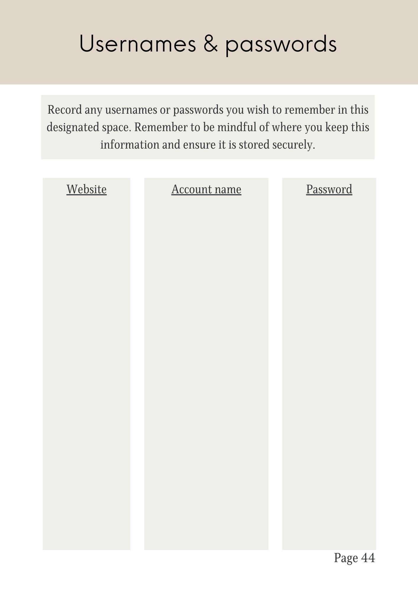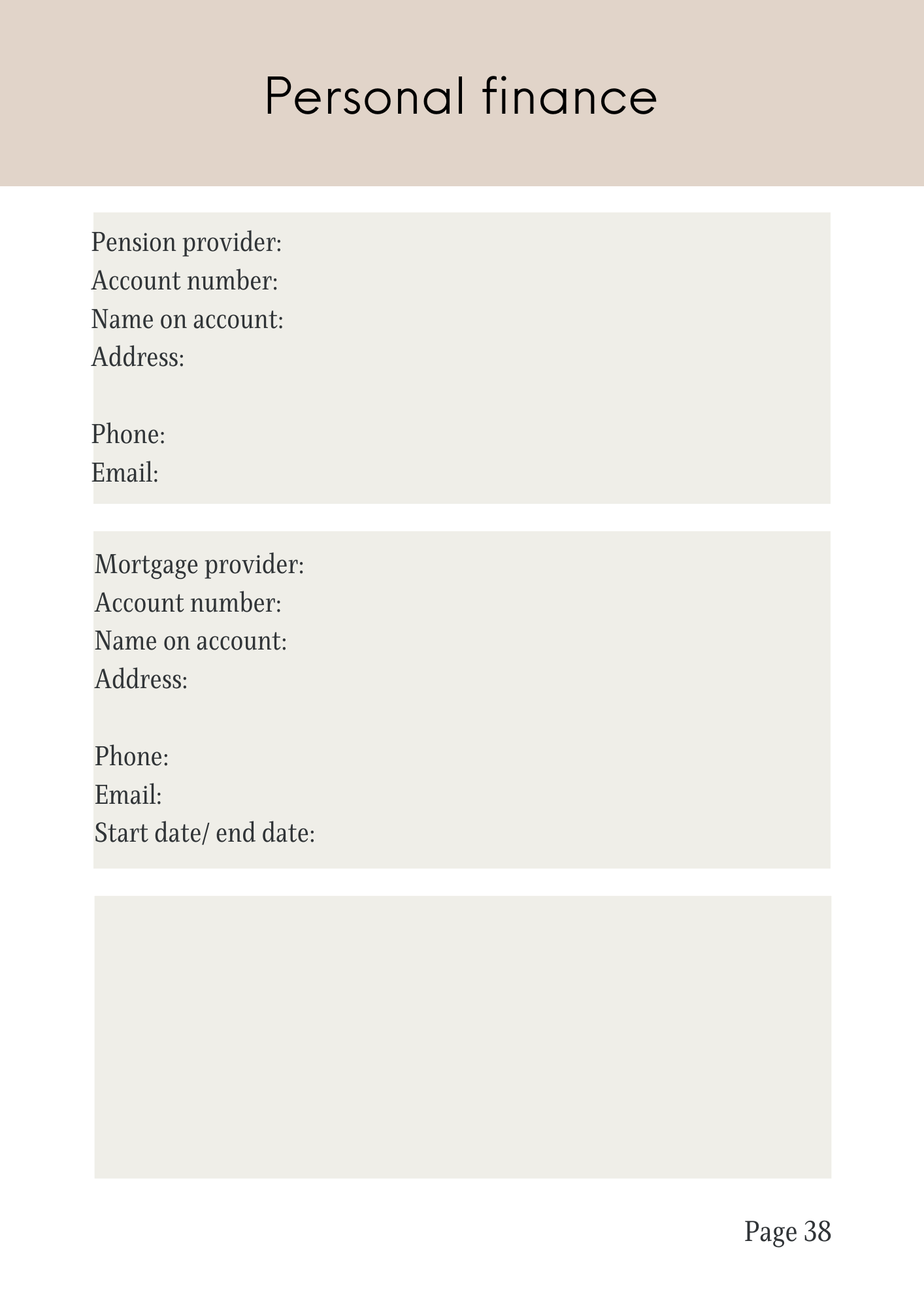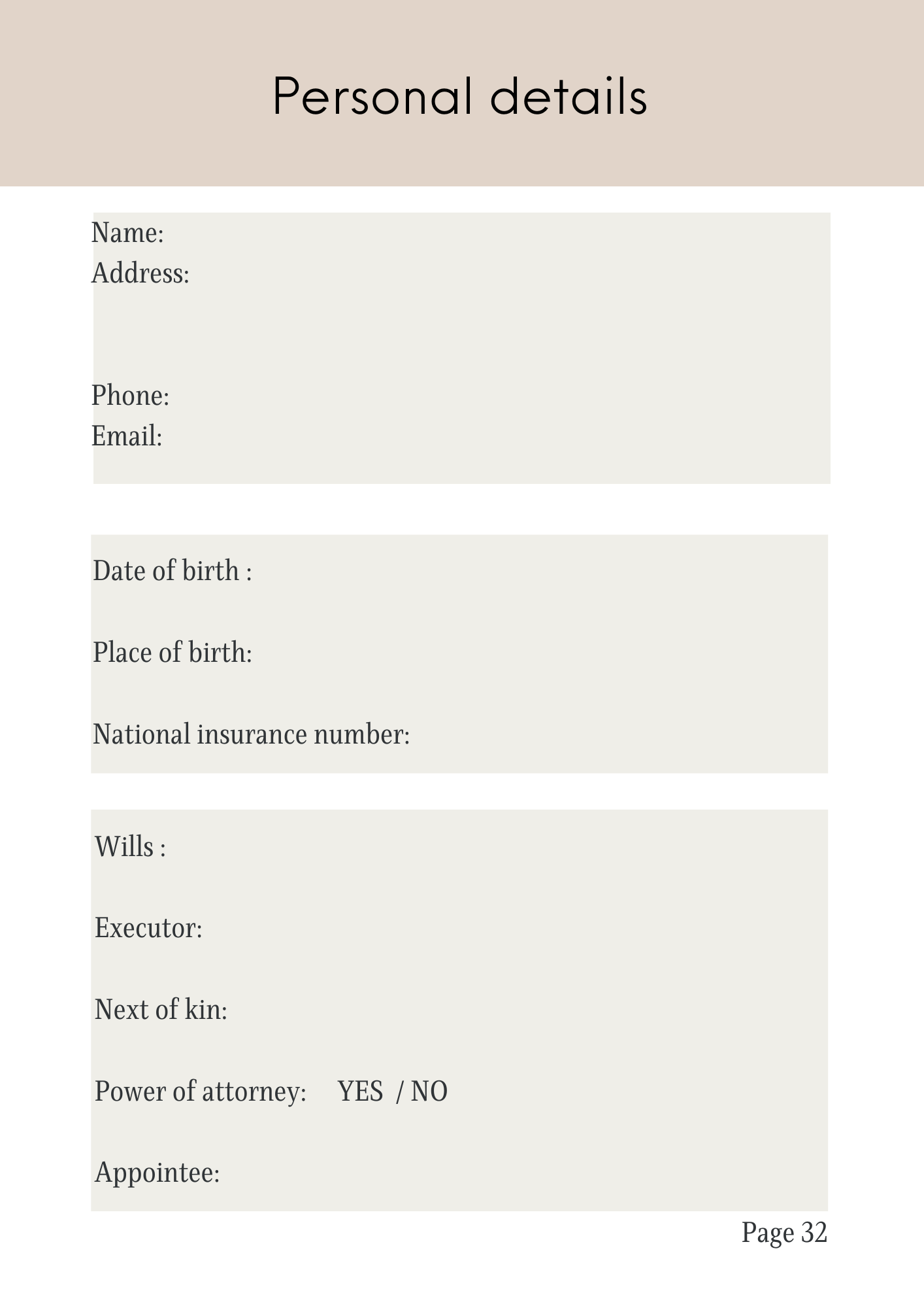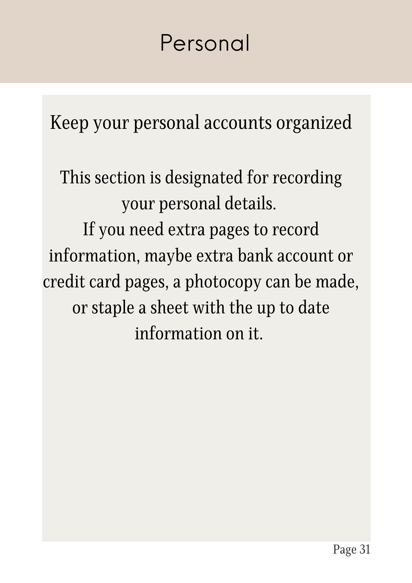 - Comprehensive sections for personal details, finances, utilities, phone contacts, and more.